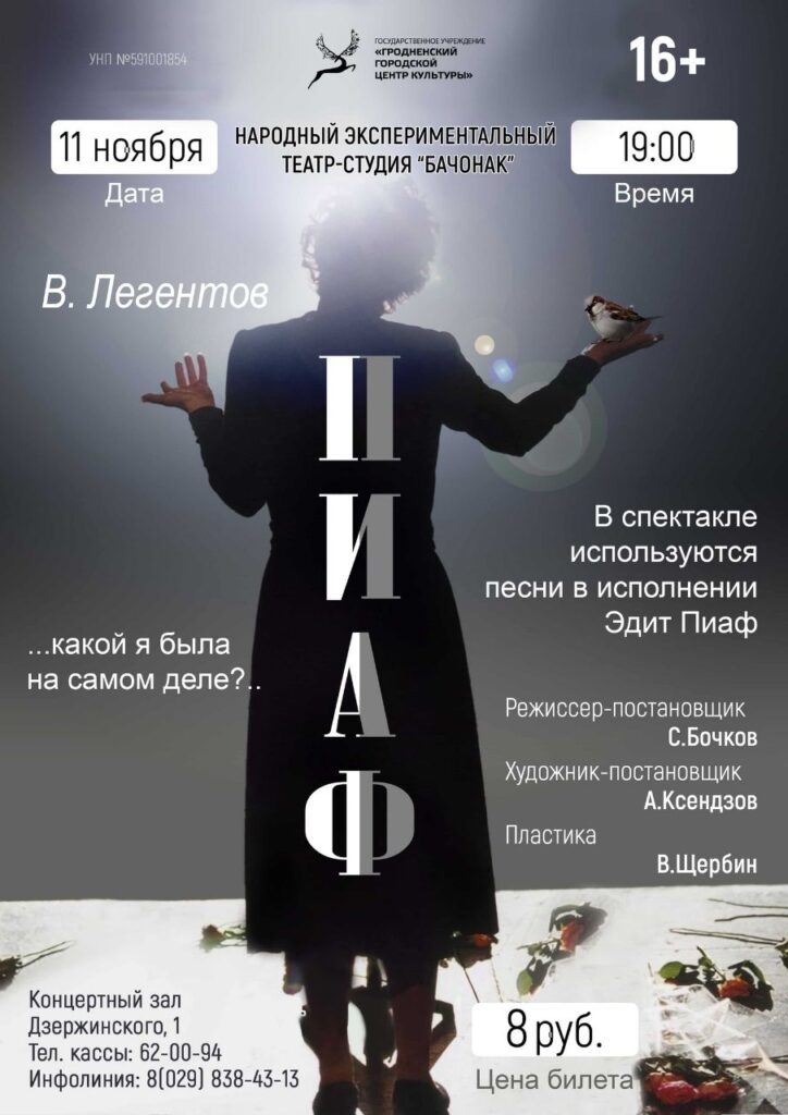 Народный экспериментальный театр-студия «Бочонок» представляет спектакль про Эдит Пиаф. Он пройдёт в Гродно 11 ноября.