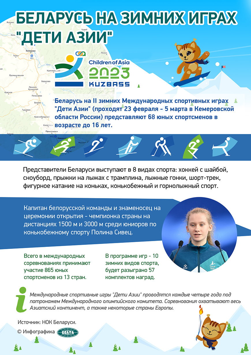 Беларусь на II зимних Международных спортивных играх «Дети Азии» (проходят 23 февраля — 5 марта в Кемеровской области России) представляют 68 юных спортсменов в возрасте до 16 лет.