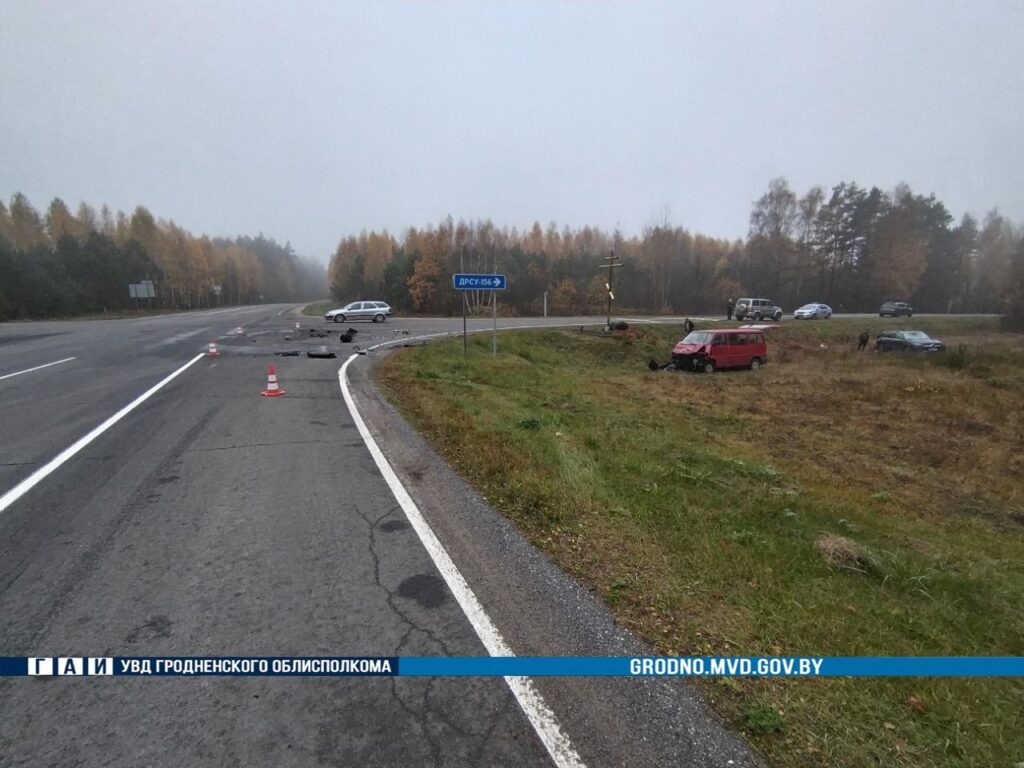 Водитель автомобиля Мерседес, двигаясь по второстепенной дороге со стороны деревни Дуды в направлении города Ивье, выехал на перекресток, не заметив движущийся в тумане автомобиль Фольксваген.