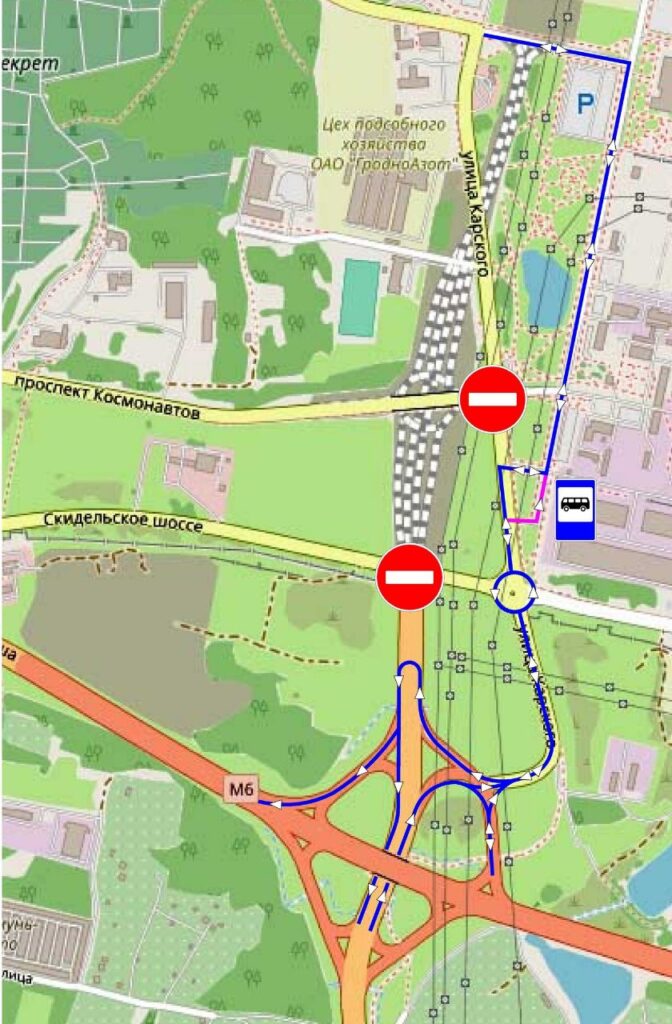 Запрещено движение транспорта в районе газонаполнительной станции по направлению Восточного моста до пересечения со Скидельским шоссе. Альтернатива – использование дороги-съезда с трассы М6 к кольцевой развязке улицы Карского и Скидельского шоссе.