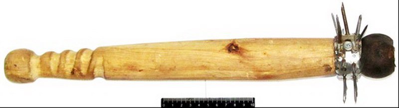 Древко-рукоять самодельного орудия и его боевая часть соединены между собой болтом. По периметру торцевой части рукояти вбито множество гвоздей различной длины и диаметра, выполняющих функцию шипов. Снизу, около упора предусмотрены пять подпальцевых выемок, предназначенных для удобства удержания изделия в руке.