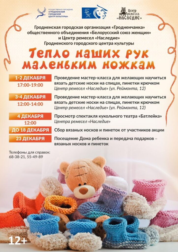 Гродненская городская организация «Гродненчанка» общественного объединения «Белорусский союз женщин» и Центр ремесел «Наследие» Гродненского городского центра культуры проводят акцию «Тепло наших рук маленьким ножкам».